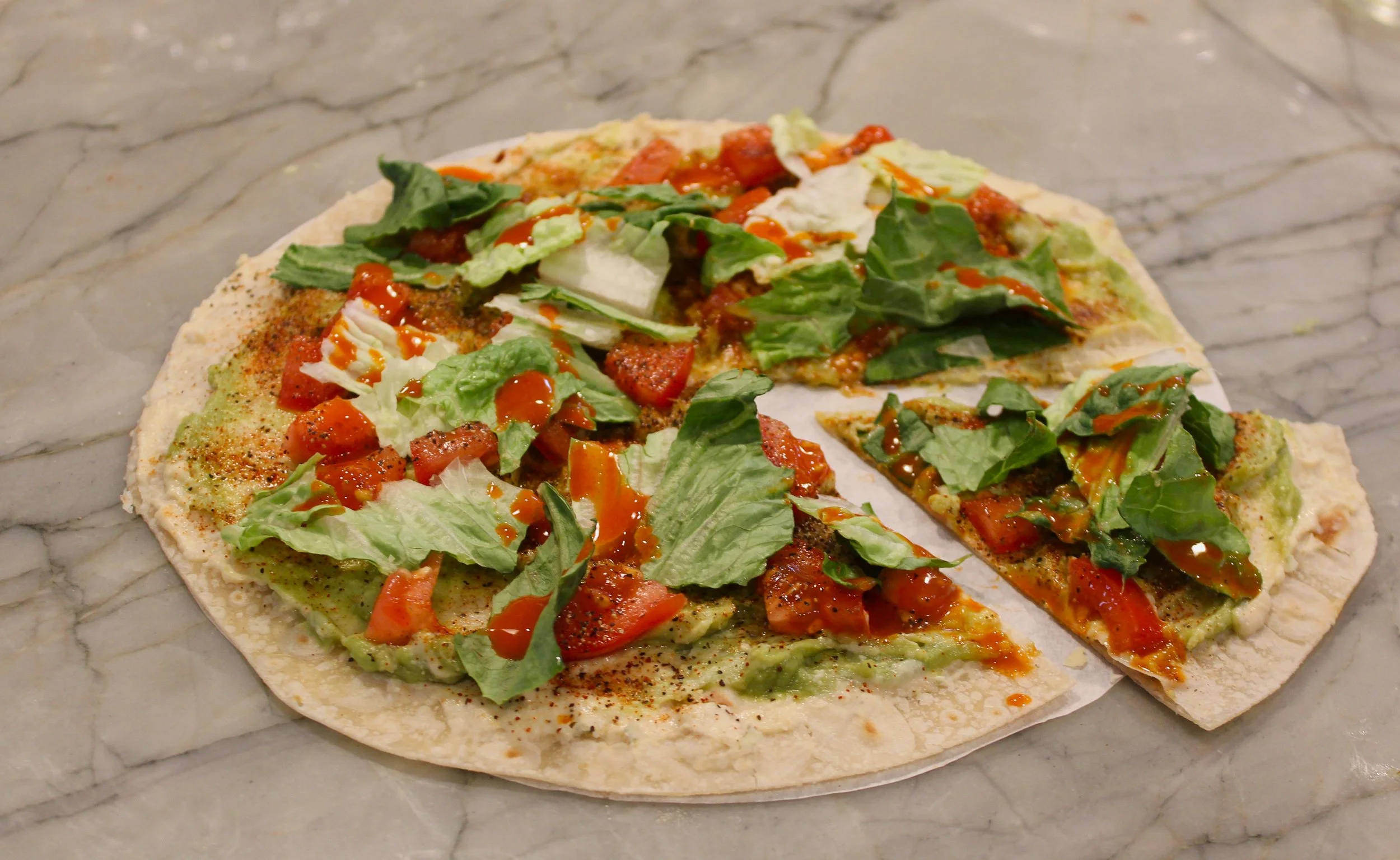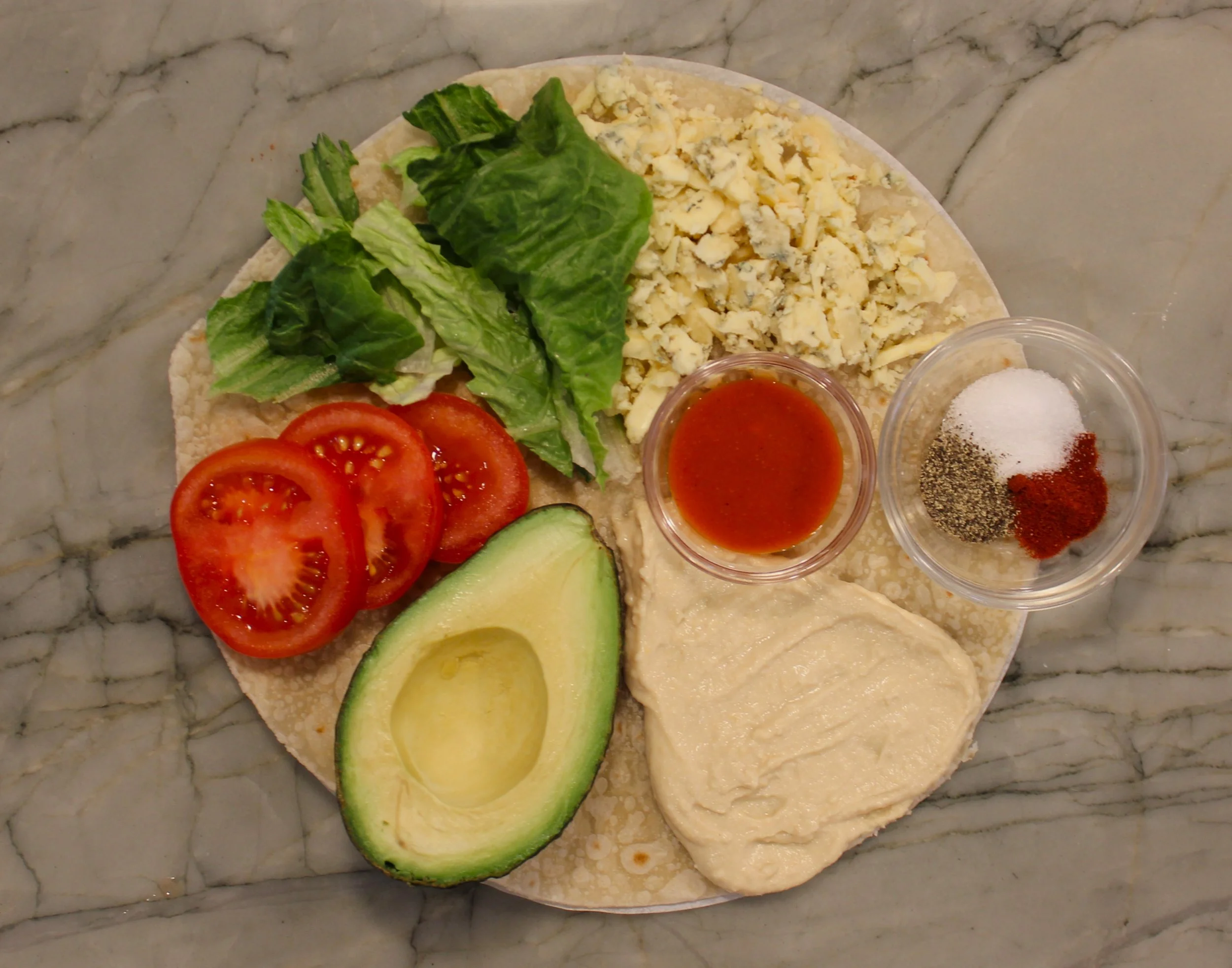 mash the avocado and hummus together with the salt, pepper, paprika, and lemon/lime juice, then spread into an even layer on the tortilla