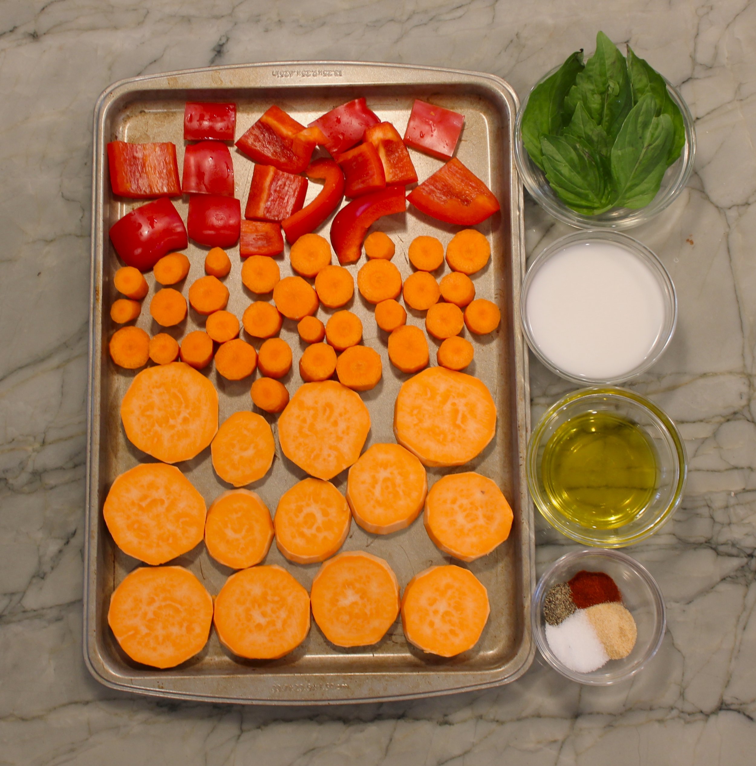 Take out of oven and add veggies to a blender, along with the fresh basil, coconut milk, water, 2tbs olive oil, and more salt, pepper, garlic powder, and paprika. (add more water until the consistency is to desired thickness)